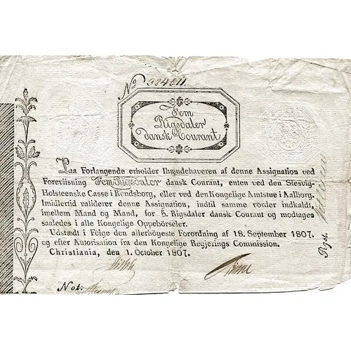 | Opis líce | No. 384811 Fem Rigsdaler Dansk Courant Paa forlangende erholder Ihændehaveren af denne Assignation ved Foreviisning Fem Rigsdaler dansk Courant, enten ved den Slesvig- Holsteenske Casse i Rendsborg, eller ved den Kongelige Amtstue i Aalborg. Imidlertid validerer denne Assignation, indtil samme vorder indkaldt, imellem Mand og Mand, for 5. Rigsdaler dansk Courant modtages saaledes i alle Kongelige Oppebörseler. Udstædt i Fölge den allerhöyeste Forordning af 18. September 1807. og efter Autorisation fra den Kongelige Regjerings Commission. Christiania, den 1. October 1807. |