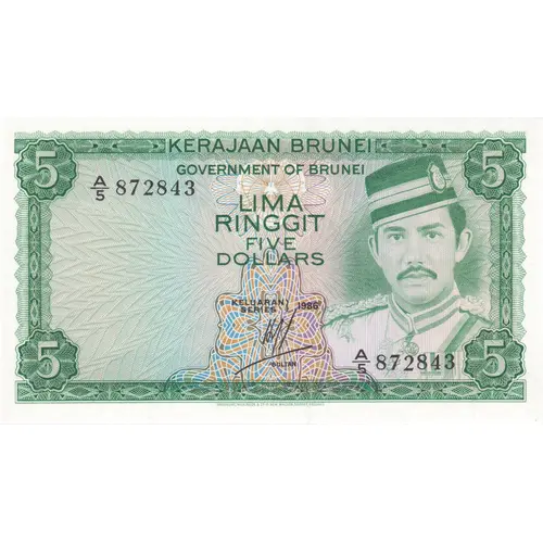 KERAJAAN BRUNEI GOVERNMENT OF BRUNEI LIMA RINGGIT FIVE DOLLARS SULTAN (Translation: Kingdom of Brunei) |