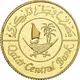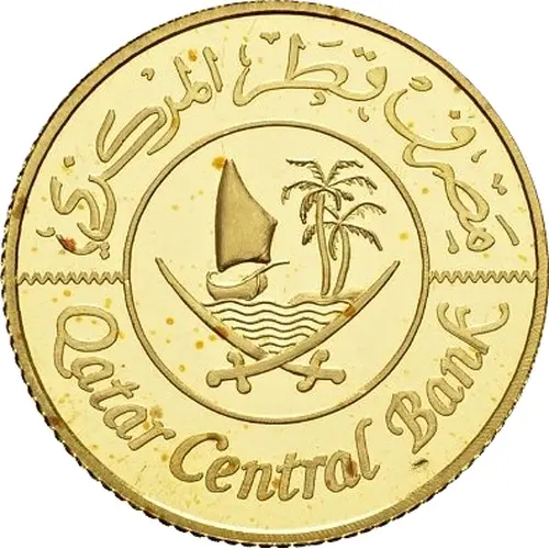 توضیحات روی سکه Emblem of Qatar consisting of two crossed bent swords, and between them a sailing ship (dhow) sailing on waves beside an island with two palm trees.