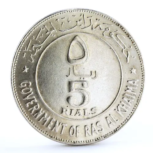 | Averslegende | ★ حُكُومَة رَأس الخَيْمَة ★ ٥ ريال 5 RIALS GOVERNMENT OF RAS AL KHAIMA (Translation: Government of Ras al-Khaimah 5 Riyals) |