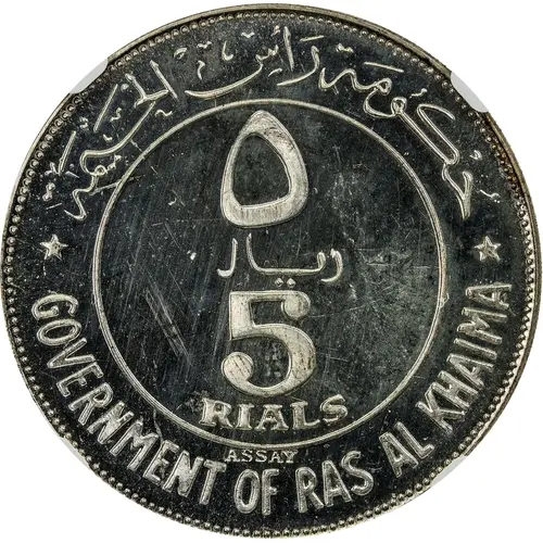 | Надписи аверса | ★ حُكُومَة رَأس الخَيْمَة ★ ٥ ريال 5 RIALS ASSAY GOVERNMENT OF RAS AL KHAIMA (Translation: Government of Ras al-Khaimah 5 Riyals Essai) |