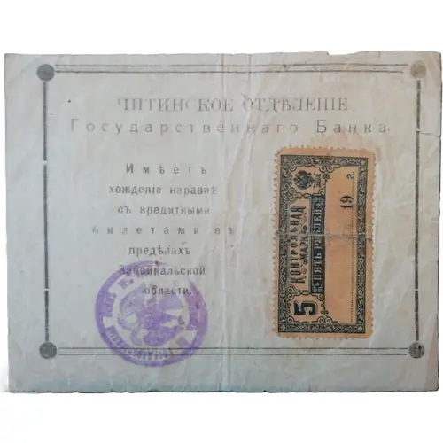 (Note) ЧИТИНСКОЕ ОТДЕЛѢНИЕ Государственнаго Банка. Имѣетъ хожденіе наравнѣ съ кредитными билетами в предѣлахъ Забайкальской области. (Paper Stamp) контрольная марка 5 пять рублей (Ink stamp) Читинское Отделение Государственного Банка (Translation: (Note) CHITA BRANCH OF THE STATE BANK. Valid for use in the Baikal region on a par with banknotes. (Paper Stamp) Control Stamp 5 five roubles (Ink stamp) Chita Branch of the State Bank) |