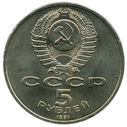 | Chữ khắc mặt trước | СССР 5 РУБЛЕЙ 1991 (Translation: USSR 5 Roubles) |
