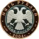 | Descrizione del dritto | On the disc – the Emblem of the Bank of Russia [the two-headed eagle with wings down, lower – the semicircular inscription – «БАНК РОССИИ» (BANK OF RUSSIA)] framed by a circle of dots, the letters to the left indicate the metal sign and the fineness, to the right – the fine metal content. The inscriptions on the ring along the rim: at the top – «ПЯТЬ РУБЛЕЙ» (FIVE ROUBLES), at the bottom – the year of issue «2004», the letters the left indicate the metal sign and the fineness, to the right – the fine metal content and the mint trade mark. |