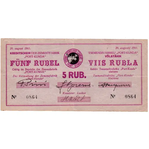 | Obverse lettering | 20. august 1941. KREDITSCHEIN DER ZEMENTFABRIK `PORT-KUNDA` FÜNF RUBEL Gültig im Bereiche der Zementfabrik `PORT-KUNDA` Die Verwaltung der Zementfabrik `Port-Kunda` PRIMA PORTLAND CEMENT PORT-KUNDA 5 RUB. Kassierer Laekur 20. augustil 1941. TSEMENDIVABRIKU `PORT-KUNDA` VÕLATÄHIK VIIS RUBLA Kehtiv Tsemendivabriku `Port-Kunda` ulatuses Tsemendivabriku `Port-Kunda` Valitsus (Translation: Credit note of the `Port-Kunda` Cement Factory 5 Rubel Valid within the `Port-Kunda` Cement Factory Board of the `Port-Kunda` Cement Factory Cashier) |