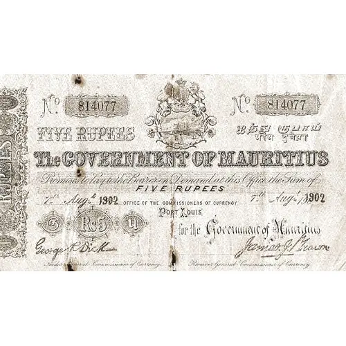 | Obverse lettering | FIVE RUPEES THE GOVERNMENT OF MAURITIUS PROMISE TO PAY THE BEARER ON DEMAND AT THIS OFFICE THE SUM OF FIVE RUPEES OFFICE OF THE COMISSIONERS OF CURRENCY PORT LOUIS |