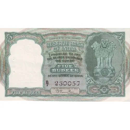 Obverse lettering GUARANTEED BY THE CENTRAL GOVERNMENT RESERVE BANK OF INDIA I PROMISE TO PAY THE BEARER ON DEMAND THE SUM OF FIVE RUPEES AT ANY OFFICE OF ISSUE FOR THE RESERVE BANK OF INDIA (SIGNATURE) GOVERNOR FIVE RUPEES