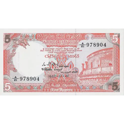 ශ්රී ලංකා මහ බැංකුව இலங்கை மத்திய வங்கி CENTRAL BANK OF CEYLON. ශ්රී ලංකාණ්ඩුව වෙනුවෙන් නිකුත් කරන ලද මේ මුදල් නෝට්ටුව ශ්රී ලංකාව ඇතුළත ඕනෑම මුදල් ගණනක් ගෙවිම සඳහා නිතියෙන් වලංගුය රුපියල් පහයි මුදල් ඈමති මහ බැංකුවේ අධිපති 1982 – 01 – 01 වටදාගෙය, විජයරාජපුර வட்டாடேஜ், பொலோனருவா VATADAGE, POLONNARUWAR ஐந்து ரூபாய் FIVE RUPEES |