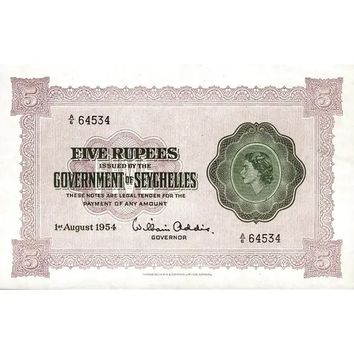 Reverse lettering GOVERNMENT OF SEYCHELLES FIVE RUPEES