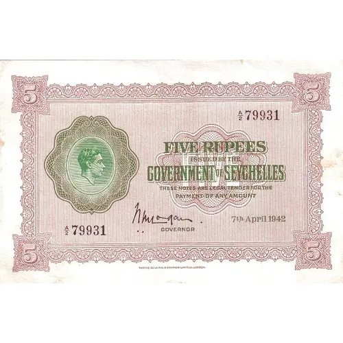 and date beneath. Uniface. Script: Latin Lettering: 5 5 A/3 61137 FIVE RUPEES ISSUED BY THE GOVERNMENT OF SEYCHELLES THESE NOTES ARE LEGAL TENDER FOR THE PAYMENT OF ANY AMOUNT 7th April 1942 GOVERNOR A/3 61137 5 5 THOMAS DE LA RUE & COMPANY, LIMITED, |