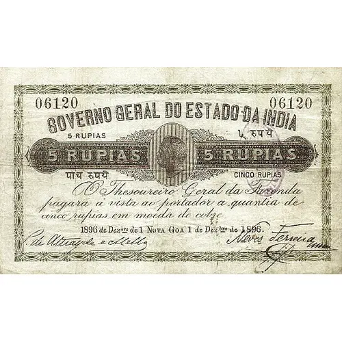 | Obverse lettering | Governo Geral do Estado da India 5 RUPIAS |
