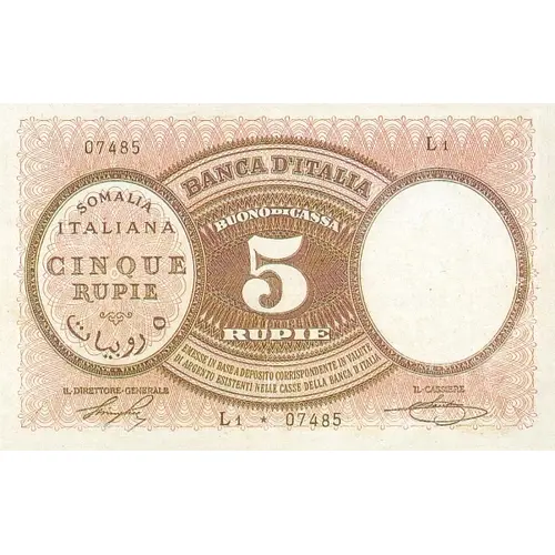 Obverse lettering BANCA D`ITALIA SOMALIA ITALIANA CINQUE RUPIE BUONO DI CASSA 5 RUPIE EMESSE IN BASE A DEPOSITO CORRISPONDENTE IN VALUTE DI ARGENTO ESISTENTI NELLE CASSE DELLA BANCA D`ITALIA