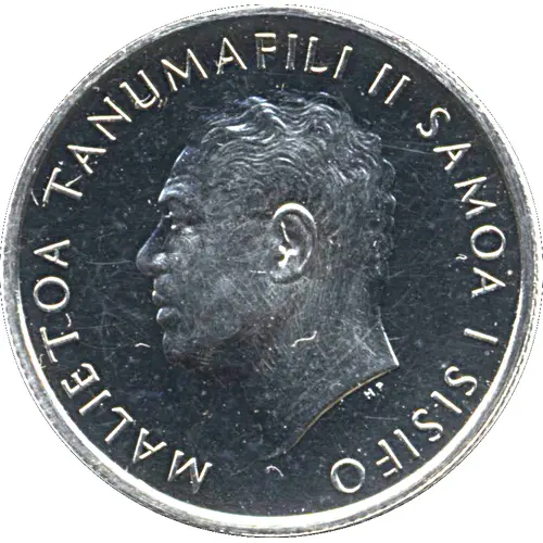 Artistry: Struck at the Royal Mint, London, the coin reflects a post-colonial numismatic style common for Commonwealth nations, blending traditional portraiture with indigenous motifs. While the specific engraver for this denomination is uncredited, the obverse features a dignified effigy of Malietoa Tanumafili II. The reverse showcases a stylized breadfruit tree, a vital staple and symbol of prosperity in Samoan culture, rendered with clean lines and balanced composition, characteristic of the era's modern coin design.