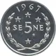 Historical Context: The 1967 5 Sene coin marks a pivotal moment in Samoan numismatic history, being among the earliest issues for the newly independent nation. Malietoa Tanumafili II, depicted on the obverse, served as Samoa's O le Ao o le Malo (head of state) for life following independence in 1962. This coinage represents a definitive break from colonial currency, asserting Samoa's sovereignty and national identity through its own distinct monetary system, featuring its revered leader.