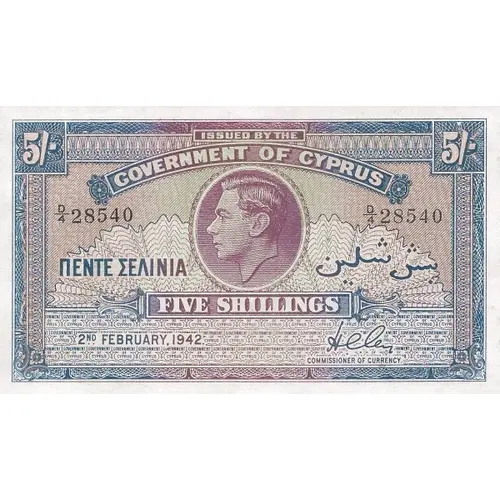| Obverse lettering | Issued by the Government of Cyprus Πεντε Σελινια Five Shillings |