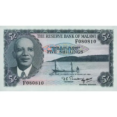 Obverse lettering THE RESERVE BANK OF MALAWI PROMISE TO PAY THE BEARER ON DEMAND THE SUM OF FIVE SHILLINGS ISSUED UNDER THE RESERVE BANK OF MALAWI ACT. 1964