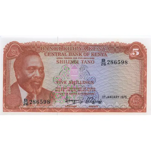 5 BANKi KUU YA KENYA CENTRAL BANK OF KENYA LEGAL TENDER FOR FIVE SHILLINGS SHILINGI TANO FIVE SHILLINGS THE FIRST PRESIDENT OF KENYA MZEE JOMO KENYATTA FOR THE BOARD OF DIRECTORS (Translation: Central Bank of Kenya Five shillings) |