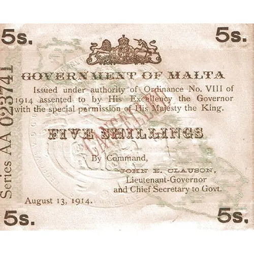Obverse lettering 5s. 5s. GOVERNMENT OF MALTA Issued under authority of Ordinance No. VIII of 1914 assented to by His Excellency the Governor with the special permission of His Majesty the King. FIVE SHILLINGS By Command, JOHN E. CLAUSON, Lieutenant-Governor and Chief Secretary to Govt. August 13, 1914. 5s. 5s.