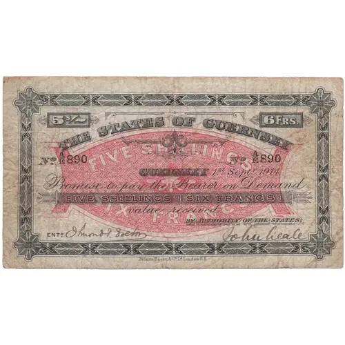| Obverse lettering | THE STATES OF GUERNSEY FIVE SHILLINGS SIX FRANCS Promise to pay the Bearer on Demand FIVE SHILLINGS (SIX FRANCS) BY AUTHORITY OF THE STATES |