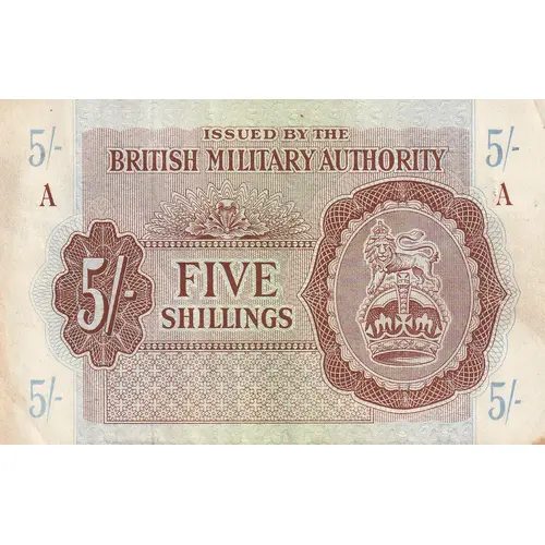 | Obverse lettering | 5/- ISSUED BY THE BRITISH MILITARY AUTHORITY FIVE SHILLINGS 5/- |