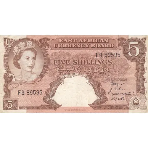 | Obverse lettering | EAST AFRICAN CURRENCY BOARD 5 FIVE SHILLINGS LEGAL TENDER FOR 5 SHILLINGS MEMBERS OF EAST AFRICAN CURRENCY BOARD 5 THOMAS DE LA RUE & CO. LTD. |