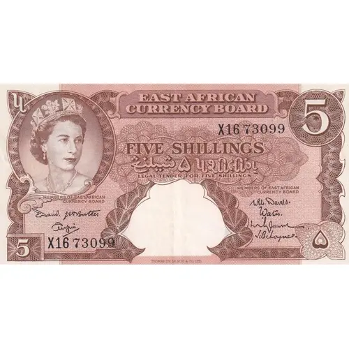 | Obverse lettering | EAST AFRICAN CURRENCY BOARD FIVE SHILLINGS LEGAL TENDER FOR FIVE SHILLINGS |