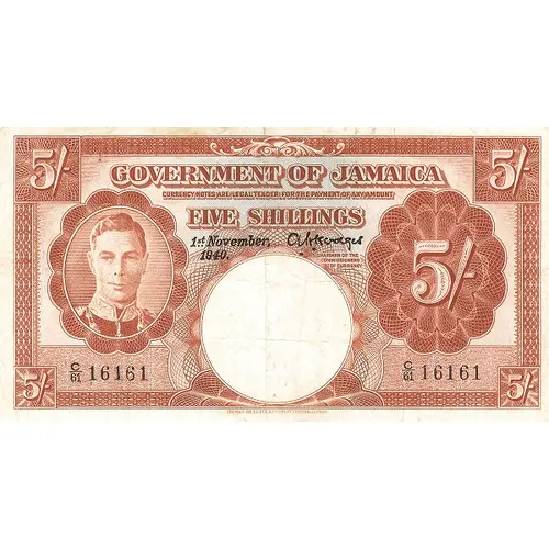 GOVERNMENT OF JAMAICA CURRENCY NOTES ARE LEGAL TENDER FOR THE PAYMENT OF ANY AMOUNT FIVE SHILLINGS CHAIRMAN OF THE COMMISSIONERS OF CURRENCY THOMAS DE LA RUE & COMPANY LIMITED LONDON |
