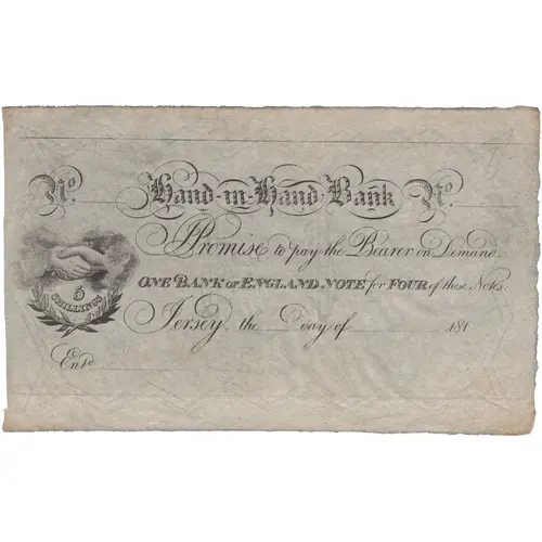 | Obverse lettering | Hand-in-Hand Bank Promise to pay the Bearer on Demand, ONE BANK OF ENGLAND NOTE for FOUR of these Notes. Jersey, the _ day of _ 181_ 5 SHILLINGS Ent. |