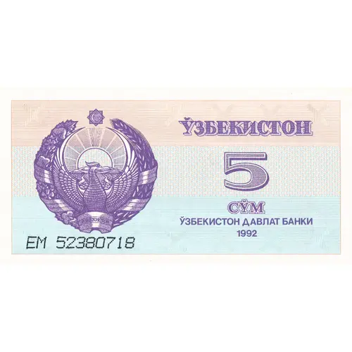 ЎЗБЕКИСТОН 5 СЎМ ЎЗБЕКИСТОН ДАВЛАТ БАНКИ 1992 (Translation: Uzbekistan, 5 Soʻm, State Bank of Uzbekistan) |