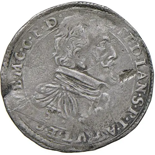 Right draped bust of Prince Federico Landi, with milled collar adorned with the golden fleece. |