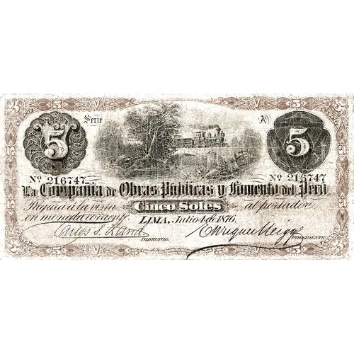 | Obverse lettering | Serie A 5 La Compañia de Obras Publicas y Fomento del Perú Pagará a la vista Cinco Soles al portador en moneda corriente. Lima, Julio 4 de 1876. (Translation: Serie A 5 The Company of Public Works and Development of Perú will pay at sight five Soles to the bearer in regular currency. Lima, July 4th., 1876.) |
