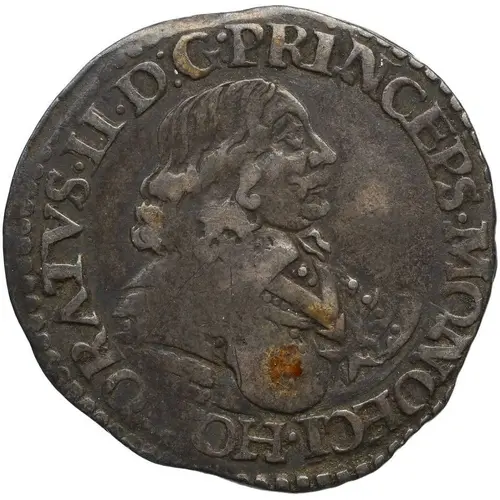 Historical Context: This 1644 5 Sols coin originates from Monaco under Honore II, a pivotal figure in the Principality's history. His reign (1604-1662) marked Monaco's transition from Spanish to French protection with the Treaty of Péronne in 1641. This silver issue, struck just three years after that momentous shift, symbolizes Monaco's burgeoning sovereignty and its alignment with the French sphere of influence, adopting French-inspired denominations like the Sol. It reflects a period of consolidation for the Grimaldi dynasty.