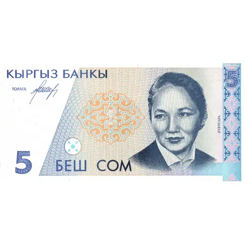 (Translation: Bank of Kyrgyzstan, Five Som)
