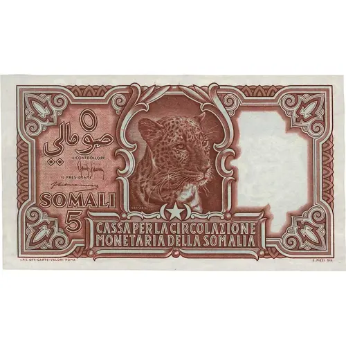 | Obverse lettering | CASSA PER LA CIRCOLAZIONE MONETARIA DELLA SOMALIA SOMALI 5 |