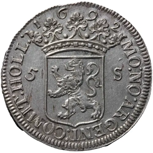 | Надписи аверса | MO : NO : ARGENT : COMIT : HOLL : 1692 5 S (Translation: New silver coinage of the County of Holland) |