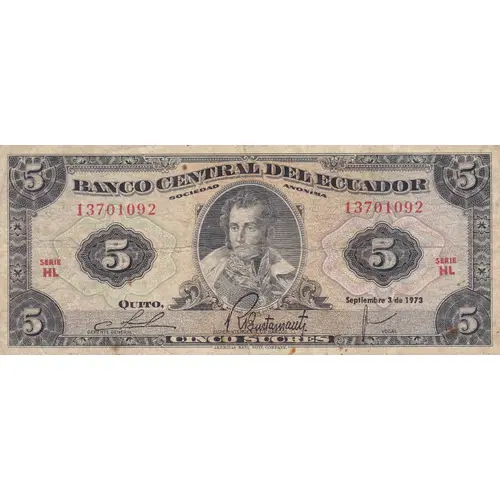 Obverse lettering Banco Central Del Ecuador sociedad anonima Antonio Jose De Sucre Cinco Sucres American Bank Note Company.