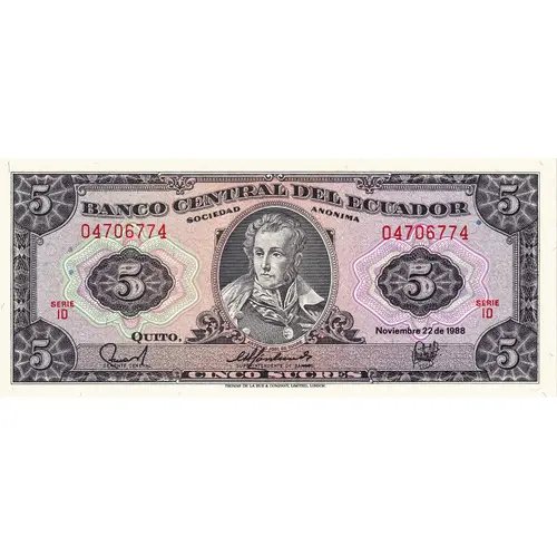 Obverse lettering BANCO CENTRAL DEL ECUADOR SOCIEDAD ANONIMA ANTONIO JOSE DE SUCRE CINCO SUCRES