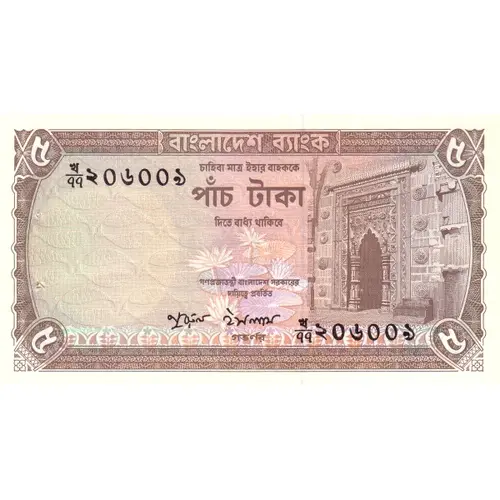 | Reverse lettering | ৫ BANGLADESH BANK 5 বাংলাদেশ ব্যাংক 5 FIVE TAKA ৫ (Translation: 5 Bangladesh Bank 5) |