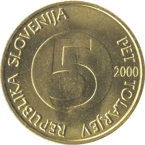 REPUBLIKA SLOVENIJA PET TOLARJEV 5 2000 (Translation: Republic of Slovenia Five Tolarjev 5 2000) |