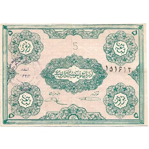 | Ön yüz açıklaması | Persian text with perforated denomination numerals at upper centre. |