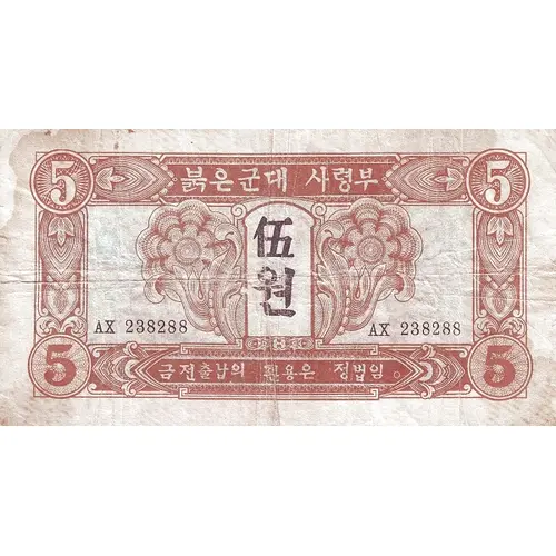 | نوشتههای روی اسکناس | 붉은군대 사령부 伍 원 1945년 금전출남의 환용은 정법임 (Translation: Red Army Command, Five Won, Year 1945, The exchange of money is a legal act) |