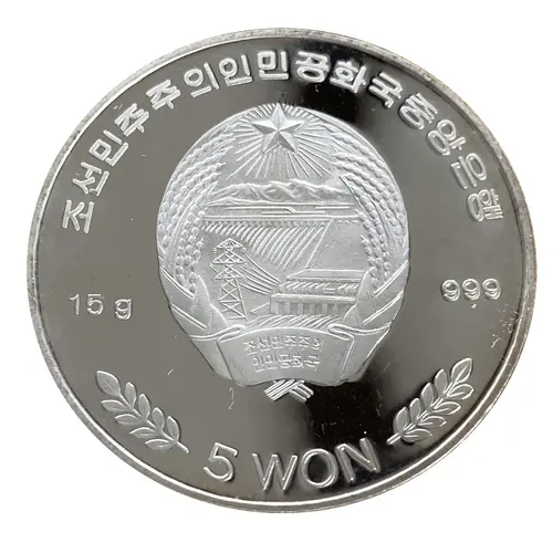 | Obverse lettering | 조선민주주의인민공화국중앙은행 15g 999 5 WON (Translation: Central Bank of the Democratic People`s Republic of Korea) |