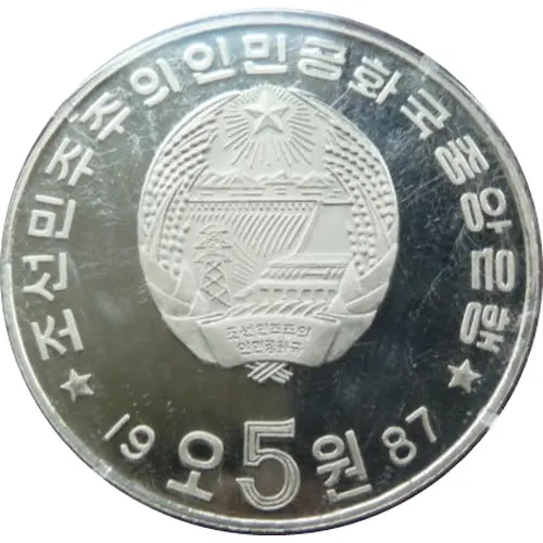 | Obverse lettering | ⋆조선민주주의인민공화국중앙은행⋆ 19 오 5 원 87 (Translation: Central Bank of the Democratic People`s Republic of Korea 5 Won) |