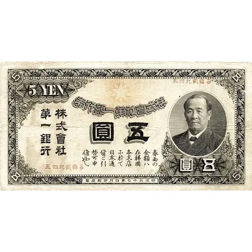 | Légende du revers | Dai-Ichi Ginko Ld. Promises to Pay the Bearer on Demand FIVE YEN IN JAPANESE CURRENCY AT ANY OF ITS BRANCHES IN COREA. |