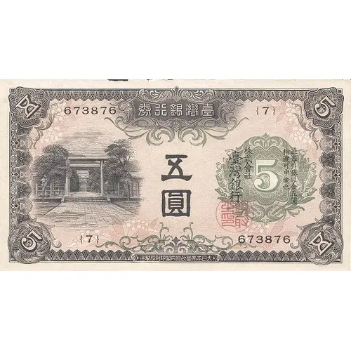 | Obverse lettering | 券行銀灣臺 臺 株 相此 五 灣 式 渡券 圓 銀 會 可引 行 社 申換 候に 也金 五 圓 造裝局刷印閣內府政國帝本日大 (Translation: Bank of Taiwan Five Yen Bank of Taiwan Corporation against which can also coupon exchange to five gold yuan Printed by National Printing Bureau, Empire of Japan) |