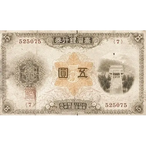 5 券行銀灣臺 五 臺 灣 銀 行 圓 5 五 俟可相壹に引此 也申渡圓金換券 五 5 (Translation: Bank of Taiwan note Five Bank of Taiwan Five Yen In exchange for this note, a corresponding amount in yen shall be paid) |