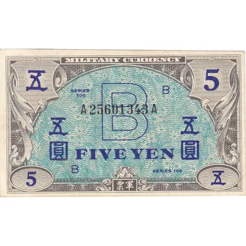 | Obverse lettering | MILITARY CURRENCY 五 5 SERIES B 100 A 25601343 A 五 五 圓 FIVE YEN 圓 B SERIES 100 5 軍票 五 (Translation: 5 5 5 Yen Yen 5 Military currency) |