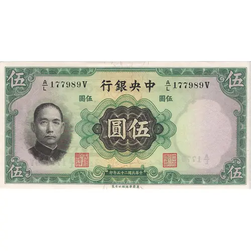 | Reverse lettering | THE CENTRAL BANK OF CHINA FIVE YUAN NATIONAL CURRENCY 1936 WATERLOW & SONS LIMITED, LONDON. |
