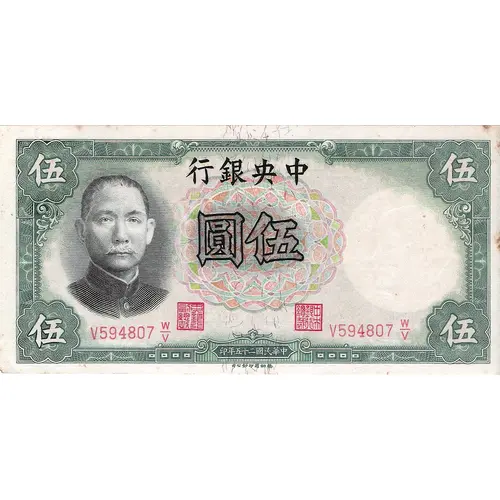THE CENTRAL BANK OF CHINA FIVE YUAN NATIONAL CURRENCY 1936 THOMAS DE LA RUE & COMPANY, LIMITED, LONDON |