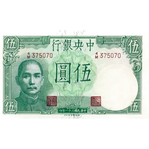 | Reverse lettering | Central Bank of China 1942 Five Yuan National Currency |